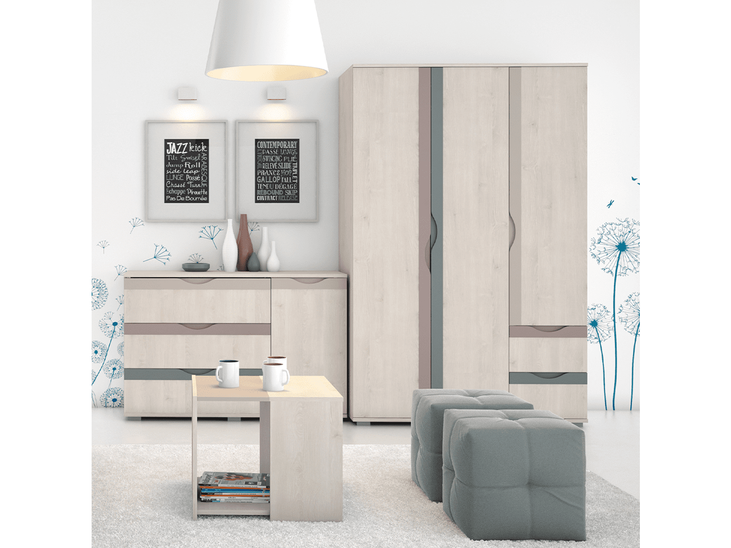 – Korpus elementa izrađen je od univera u drvo-dekoru Polarni bor u kombinaciji sa medijapanom u boji pesak