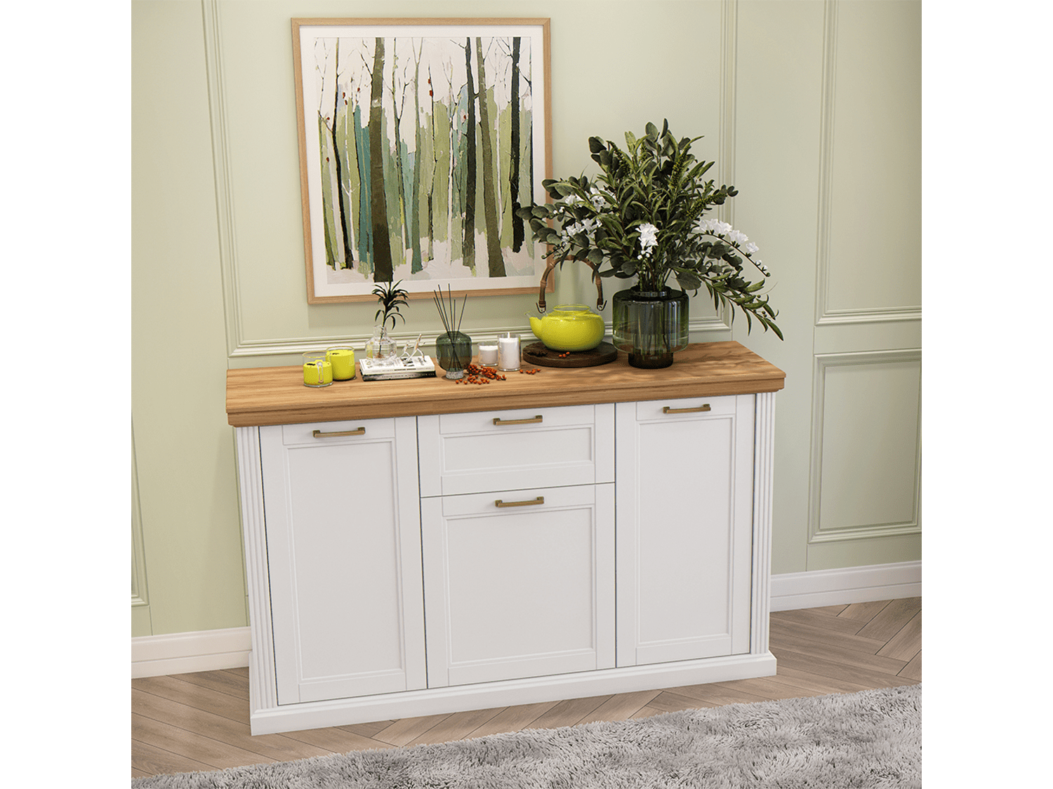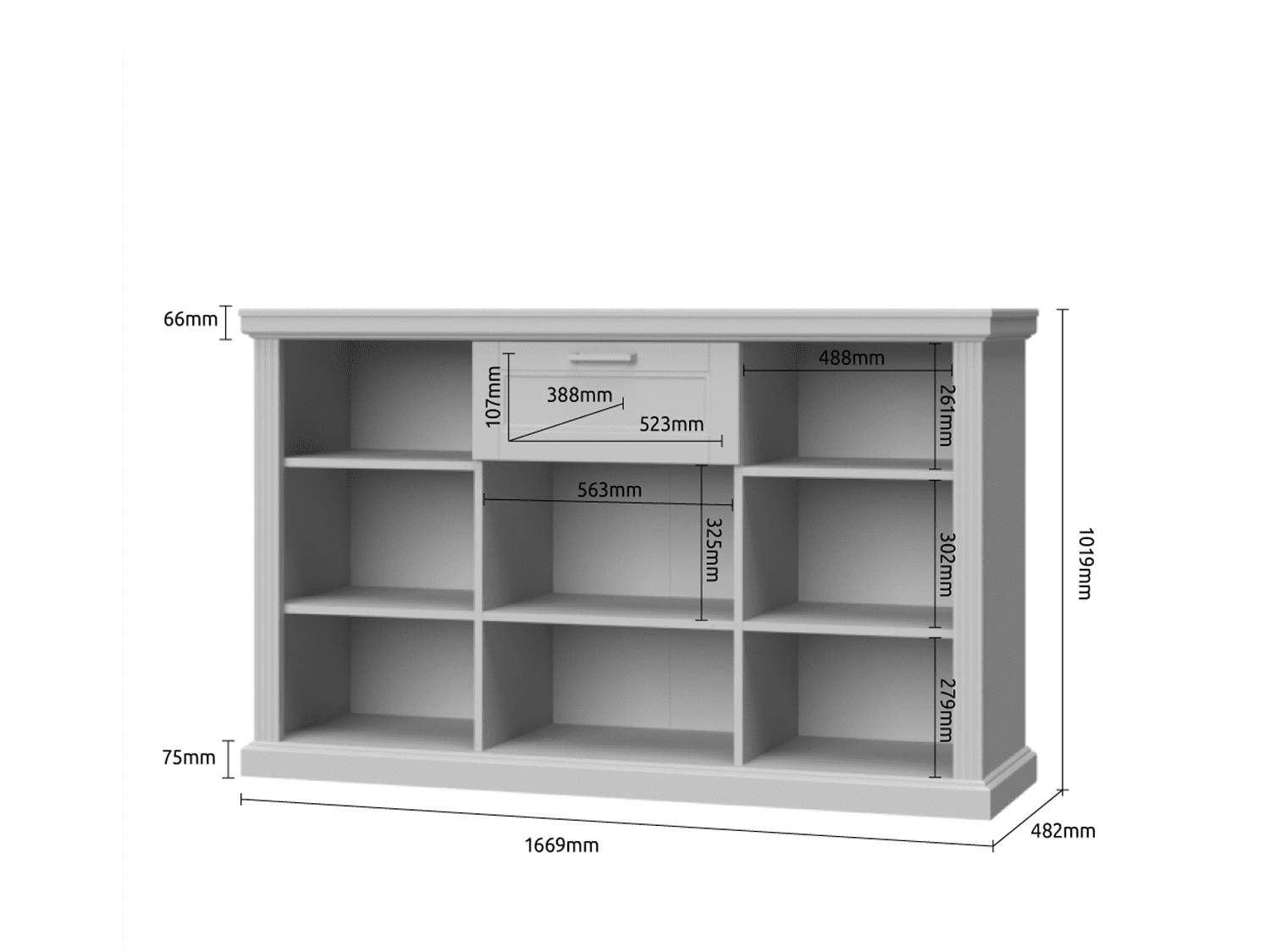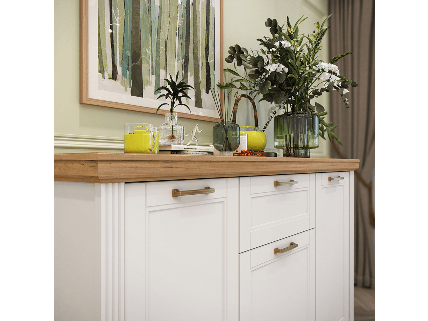 – Poseduje pet polica od univera, soft-close šarke, soft-close klizače i dekorativne ručice