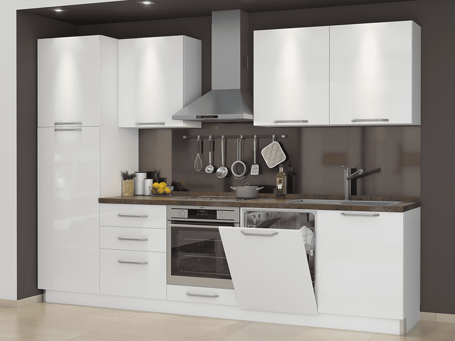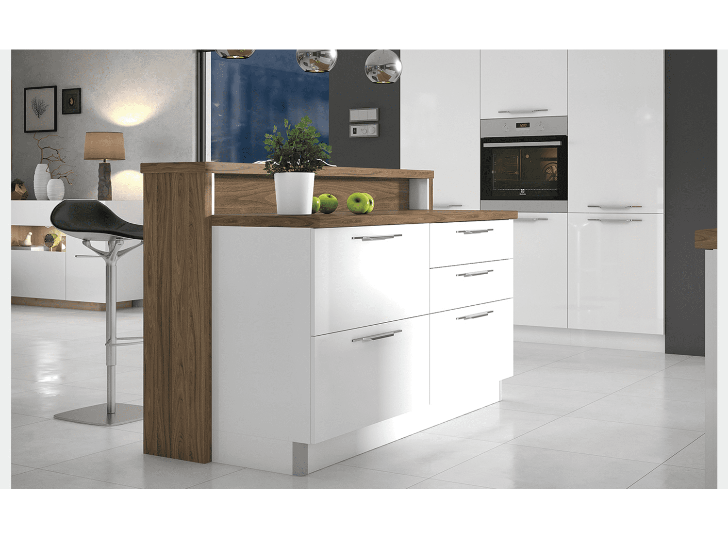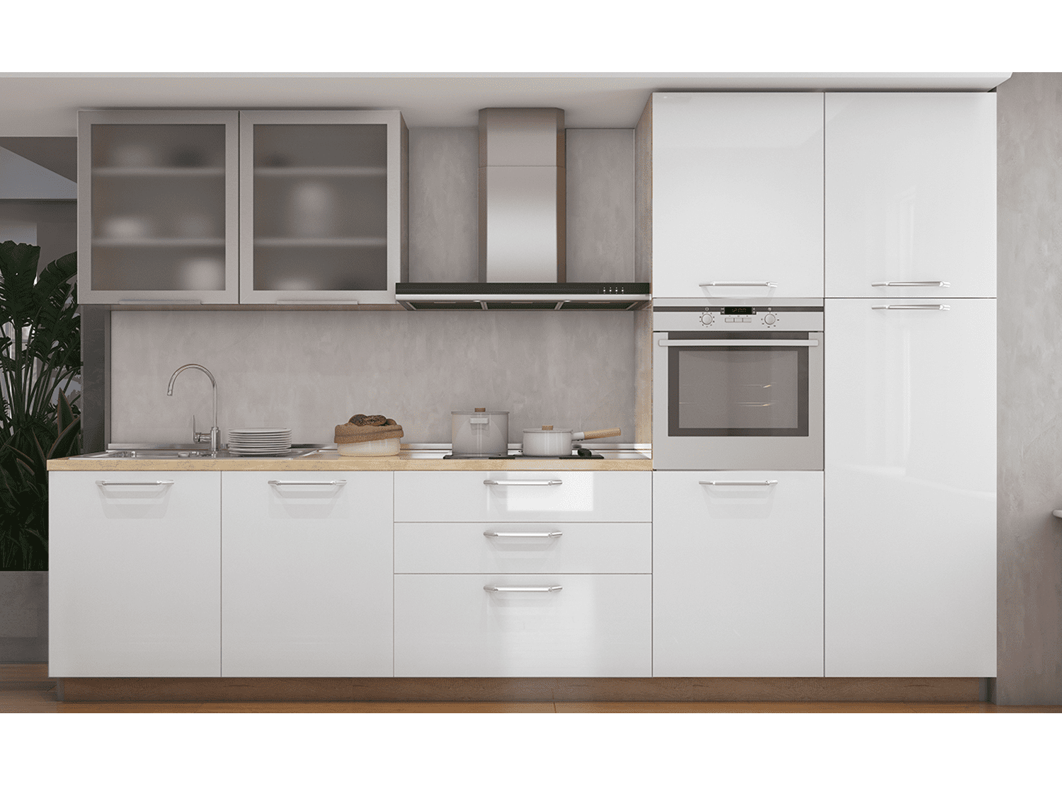 – Svi elementi poseduju soft-close sistem za tiho zatvaranje, kao i mogućnost odabira ručica, radne ploče, bočnih strana i sokle iz širokog spektra ponude