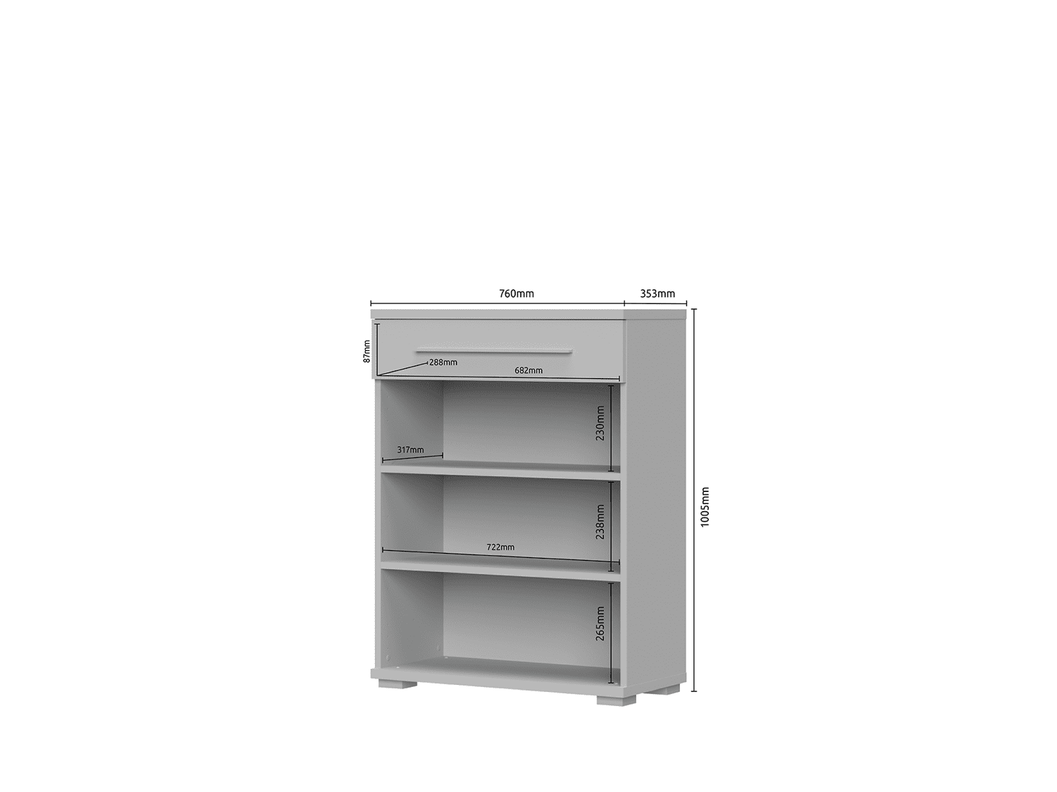 – Poseduje fioku, hromiranu ručicu, soft-close šarke, soft-close klizače, dve police od univera debljine 18mm i hromirane podesive nožice