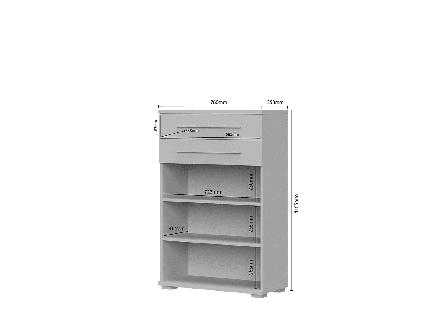 – Poseduje dve fioke, tri hromirane ručice, soft-close šarke, soft-close klizače, dve police od univera debljine 18mm i hromirane podesive nožice