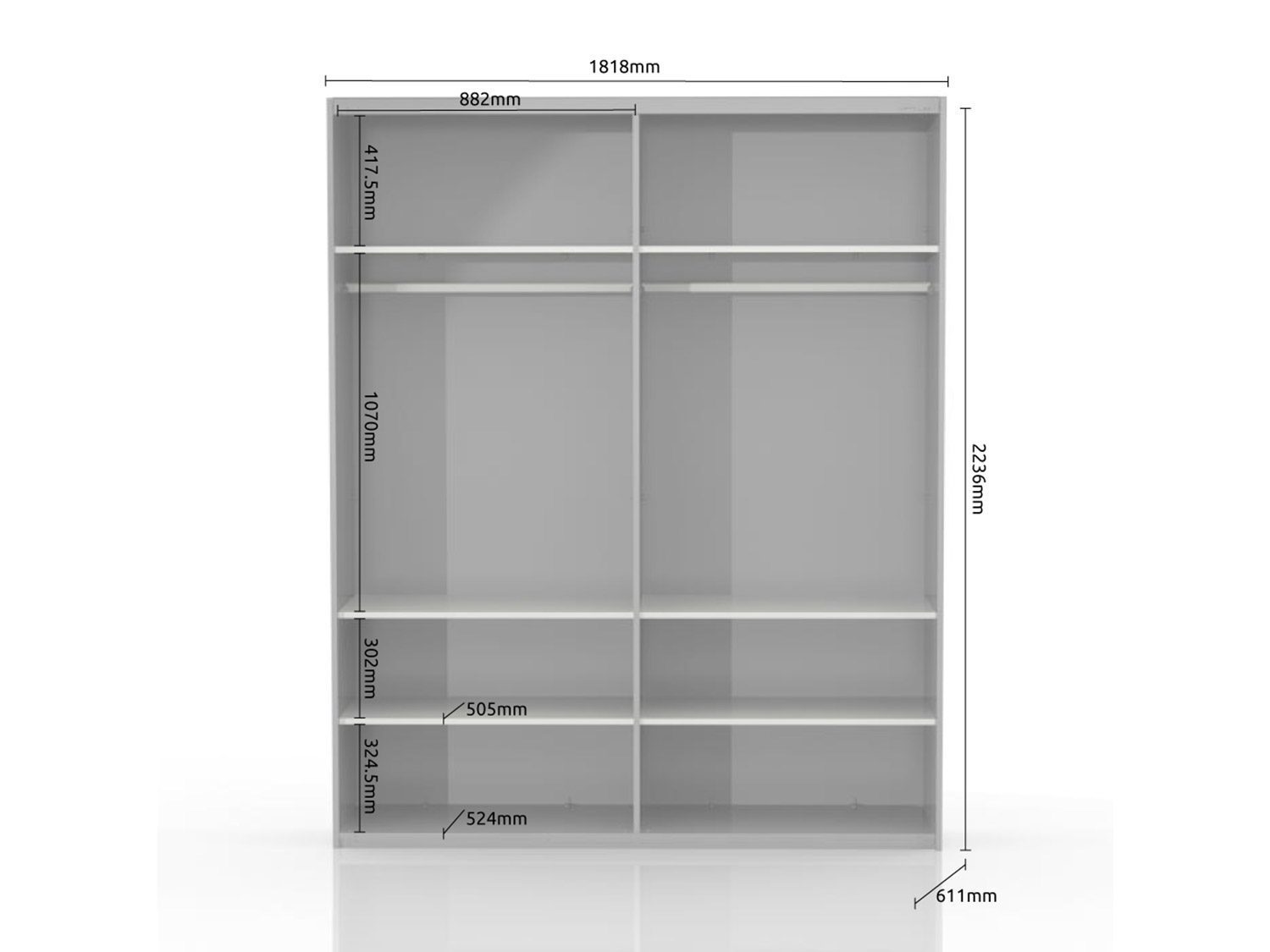 – Poseduje šest fahova,dve garderobne šipke,soft-close mehanizam za zatvaranje krila,hromirane integrisane ručice