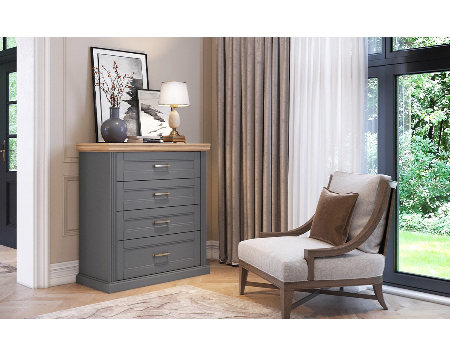 – Poseduje soft-close klizače sa usporivačima, podesive nožice za nivelisanje na neravnim površinama, dekorativne ručice