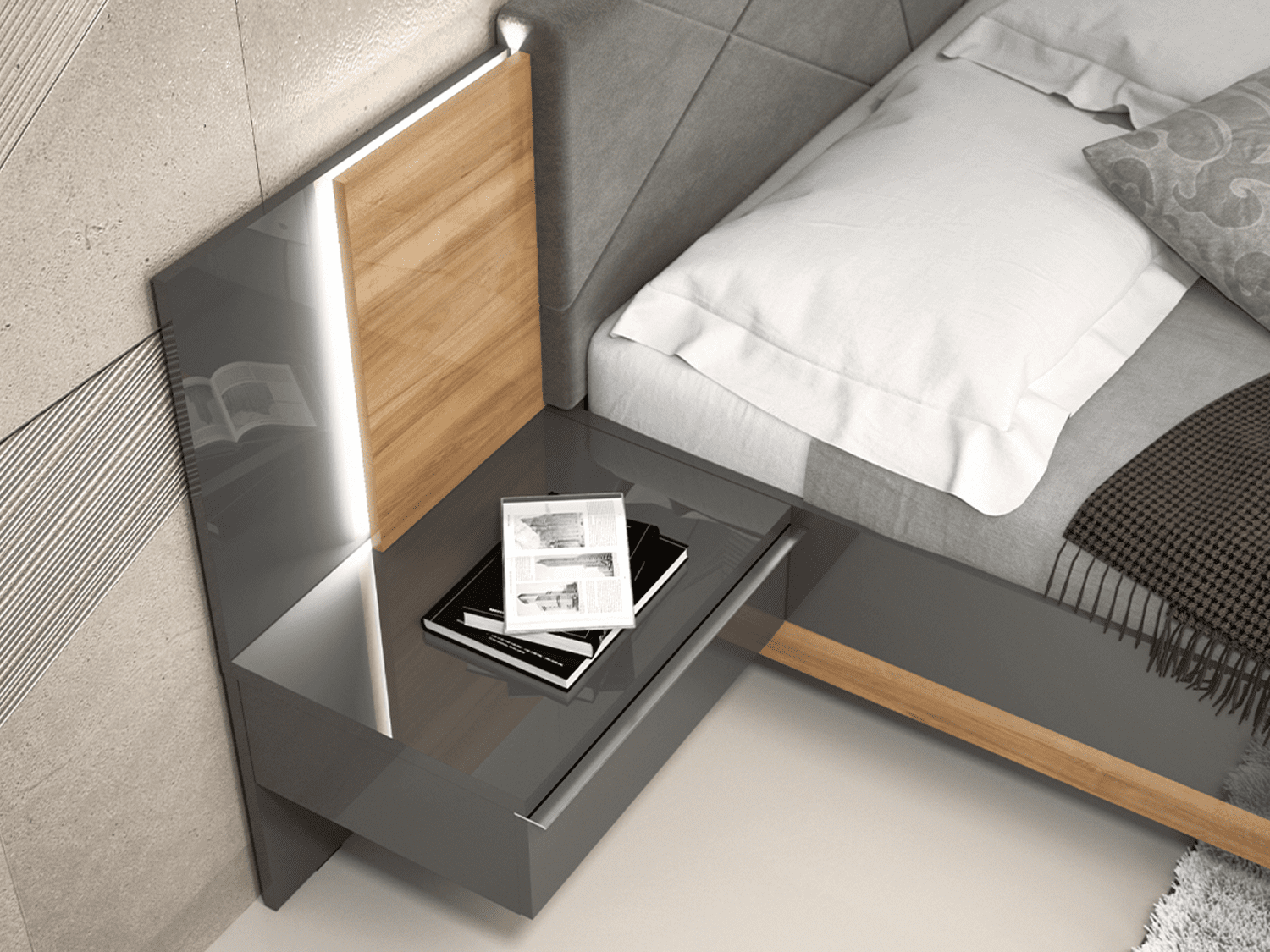 – Noćni stočić sa jednom fiokom i zidnim panelom sa rasvetom