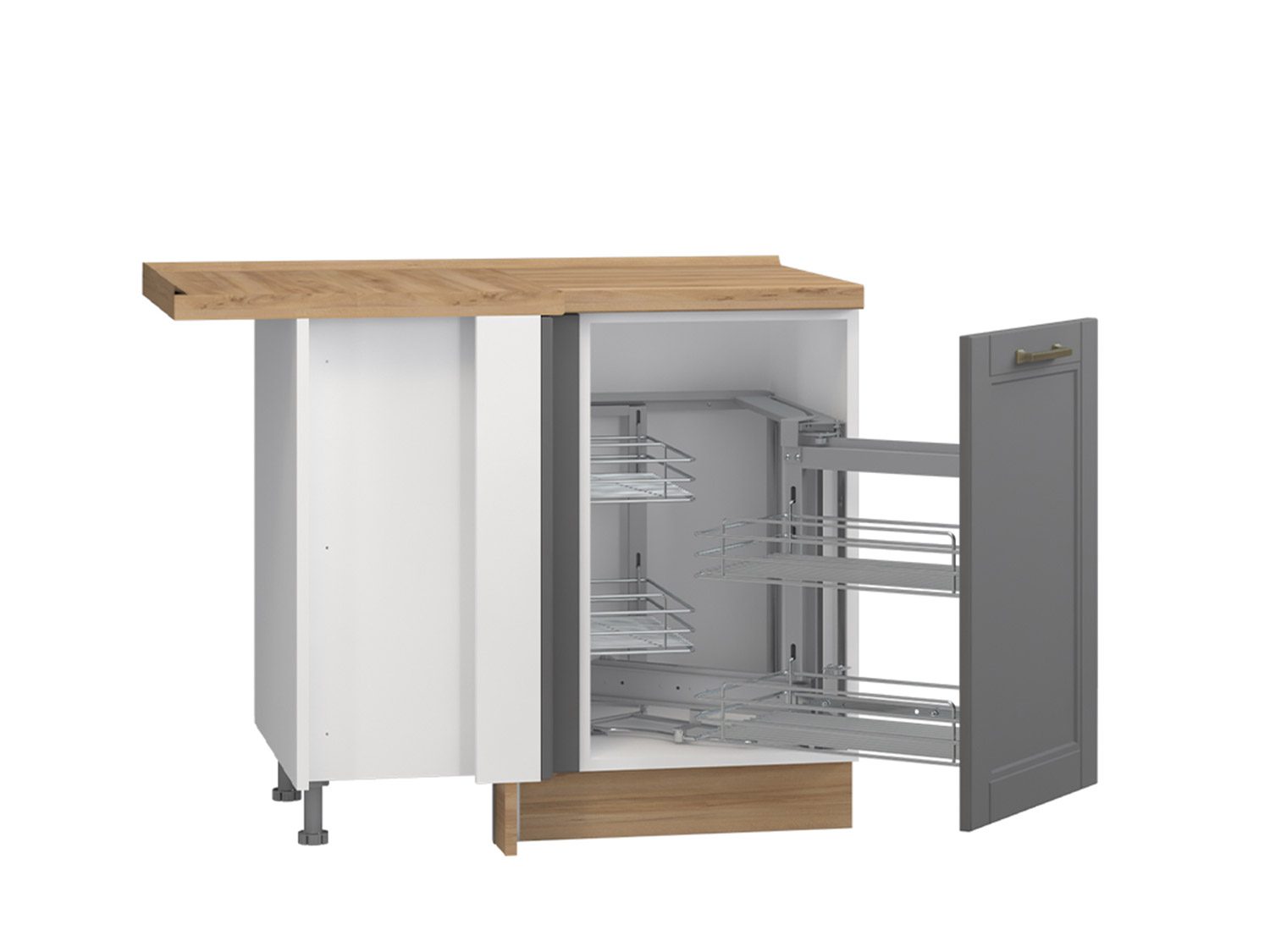 -Radni kuhinjski ugaoni element iz kolekcije Tara sa jednim krilom i mehanizmom sa hromiranim žičanim korpama za odlaganje. Krilo se otvara na desnu stranu